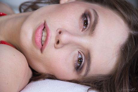 Cute teen Karen models totally naked on her bed with self-assuredness