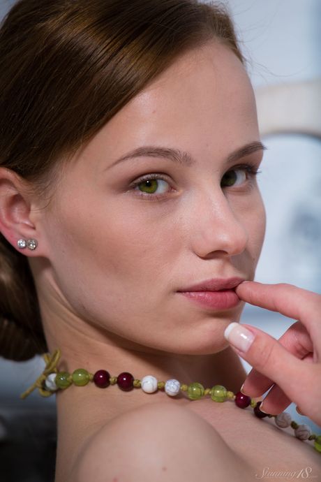 Lean teen Mia shows her small tits and poses on a vintage armchair