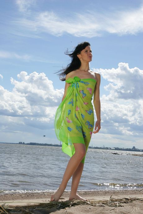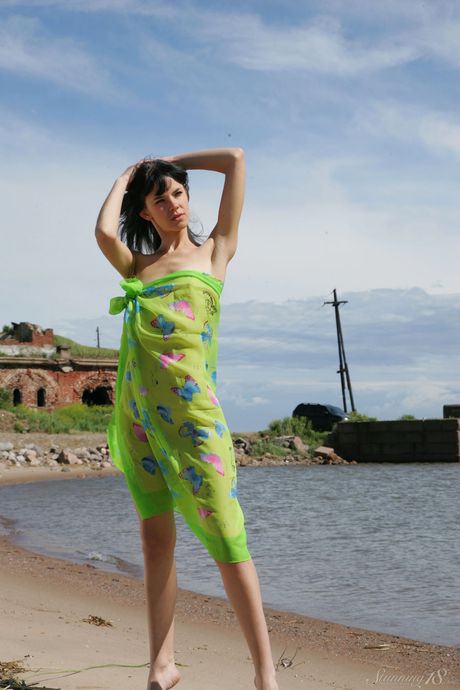 Petite teen Anais highlights her tight ass while naked on a sandy beach