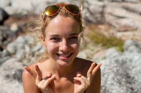 Russian beautiful Delilah G gets naked in a pair of sunglasses on a beach