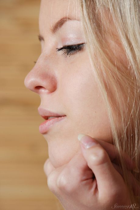 Skinny blonde teen Barbara D gets naked on a bamboo chair
