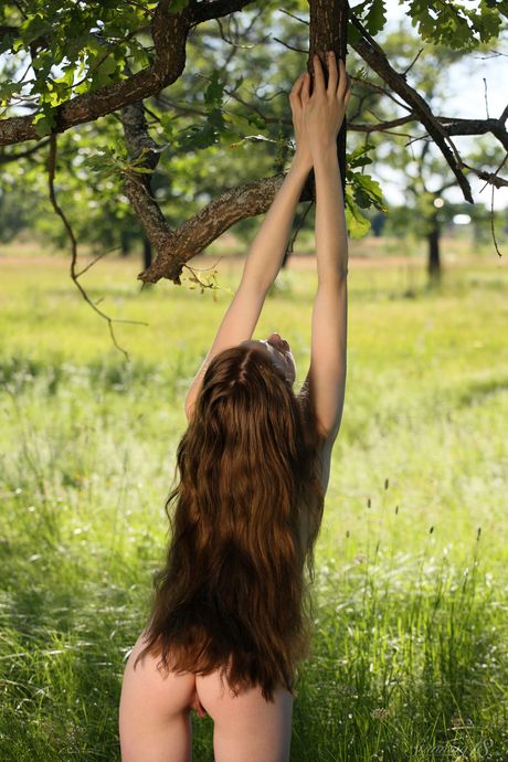 Svelte teen Nicole poses nude under an apple tree & shows her pierced pussy