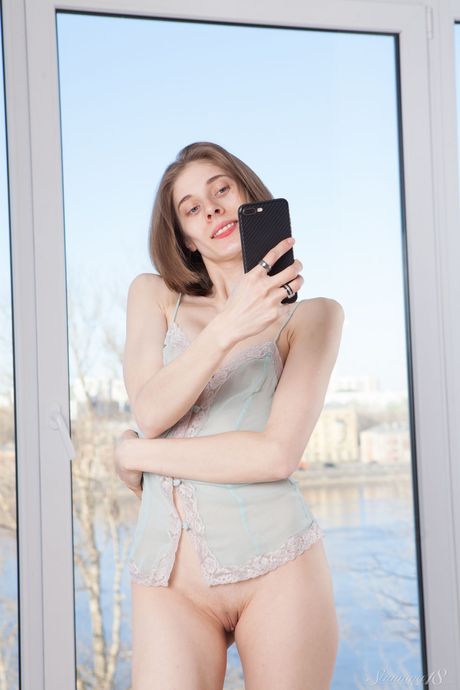 Sweet blonde teen Anna R poses naked without embarrassment during a solo shoot