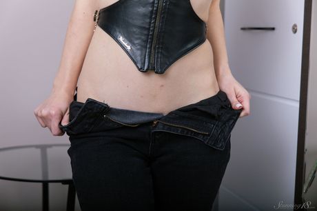 Teen model Kassandra removes a leather jacket and jeans to pose nude