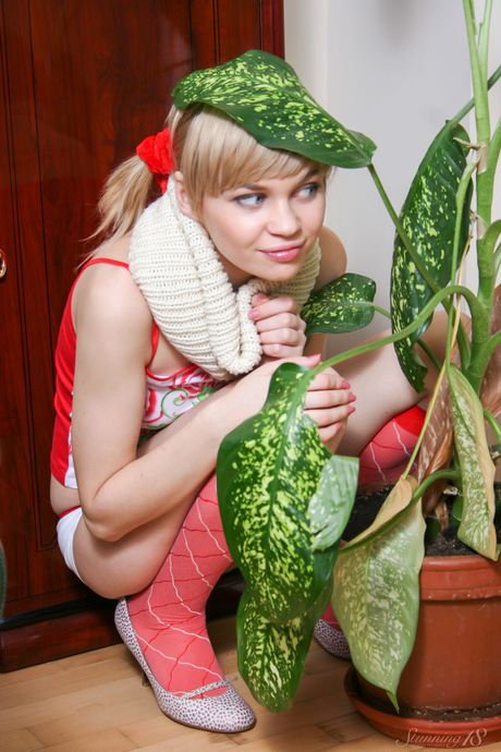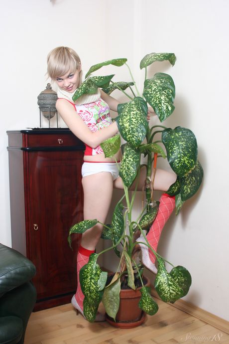 Young blonde Cindy B gets naked in a pair of socks in a greenhouse