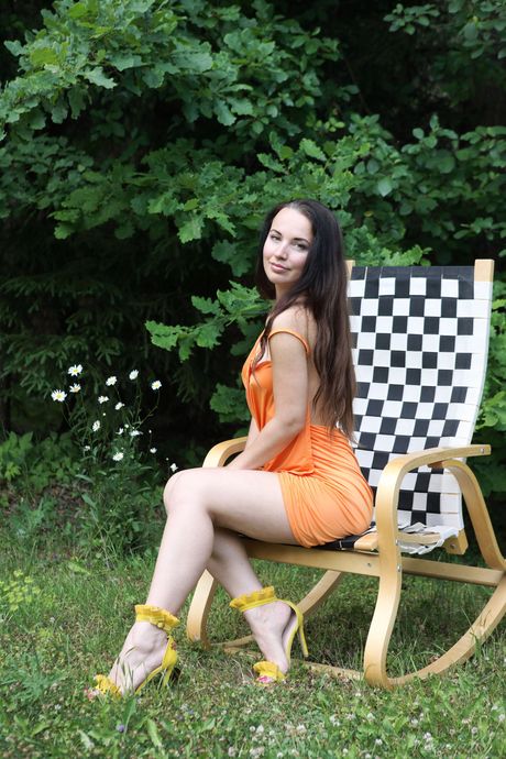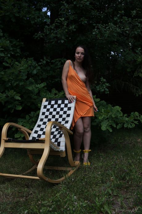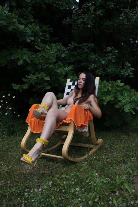 Young blonde Nicole V strips down on a rocking chair in a backyard