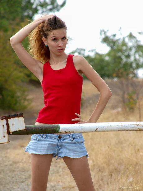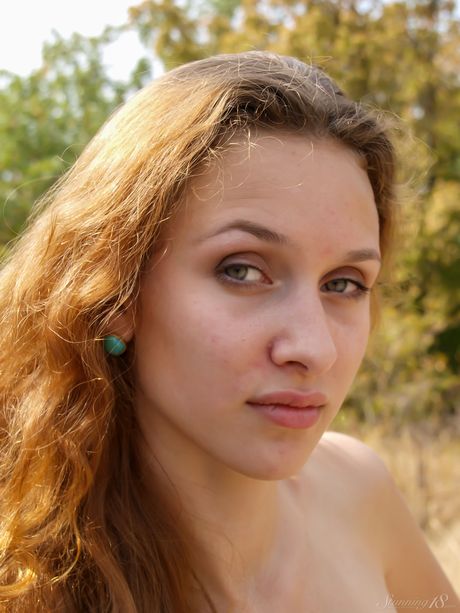 Young redhead Demetria N gets naked on a sandy beach in high heels