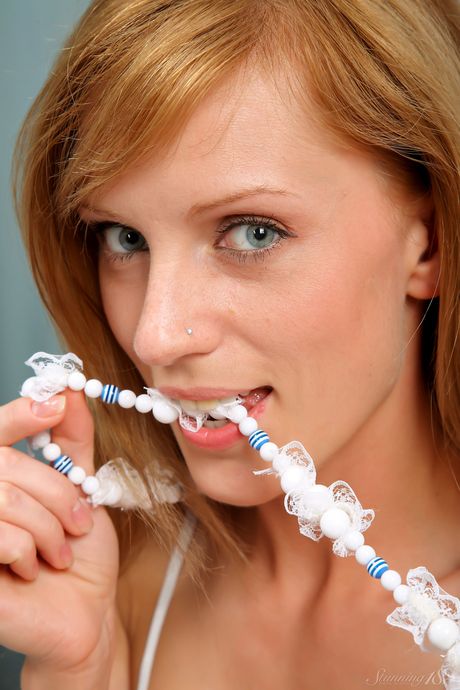 Young redhead Pax R removes a bra and thong set to get naked on her bed