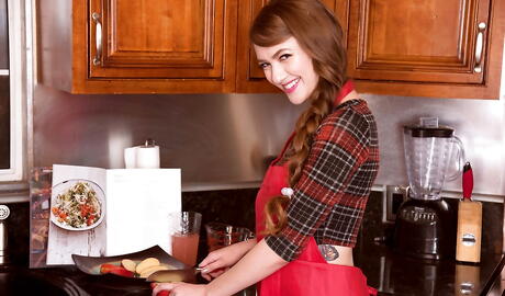 Stunning american babe Samantha Hayes in hot lingerie exposing small tits and hot ass in kitchen