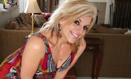 Stunning american blonde mature Sierra Smith reveals her ass in nice skirt and spreads her legs