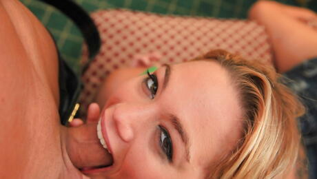 Stunning american blonde Victoria White deep throating dick and gets a cum blast in mouth