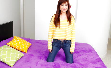 Stunning american dark-haired teen Kelly Kitty in tight jeans uncovers tiny tits and jerks off