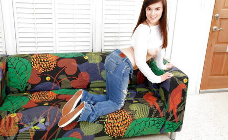 Stunning american young Paris Lincoln in jeans exhibiting big tits and jerking off