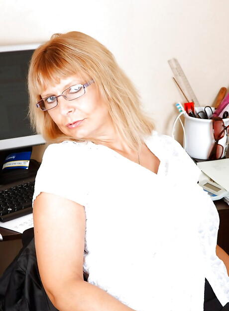 Stunning blond mature Alex in underwear baring big tits and masturbating in office