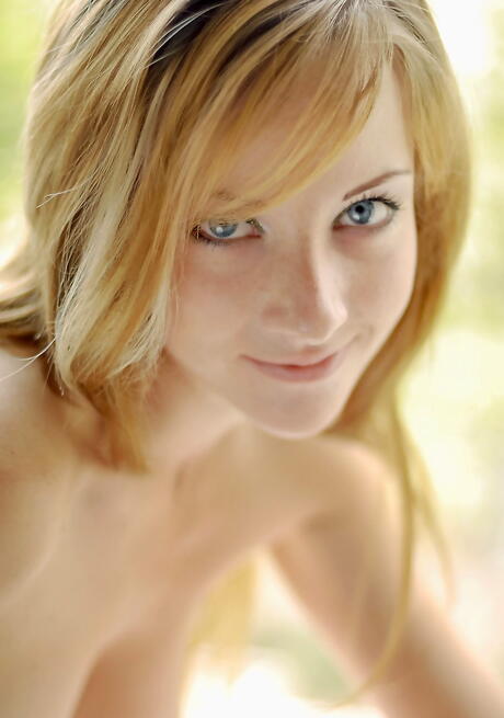 Stunning blond young Naddia spreading her legs outside