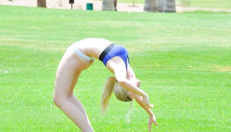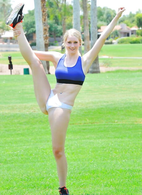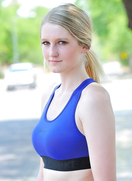 Stunning blond youthful Summer Carter shows big tits and sexy butt outside