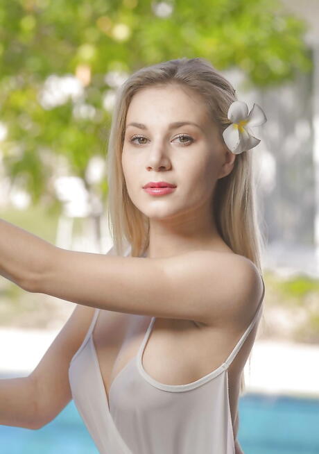 Stunning blonde babe Candy shows her ass in and shaved pussy at pool