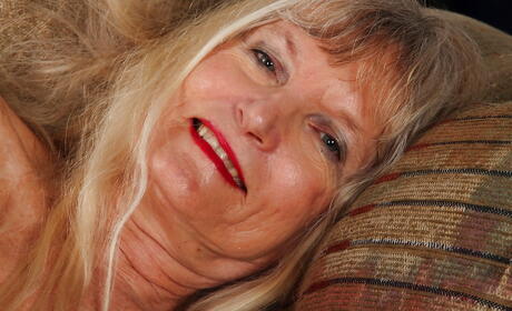 Stunning blonde older Lisa Cognee exhibiting big titties and stuffing her snatch with a toy