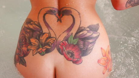 Stunning british brunette Daniella Mae exhibits big hooters and ass in the bathroom