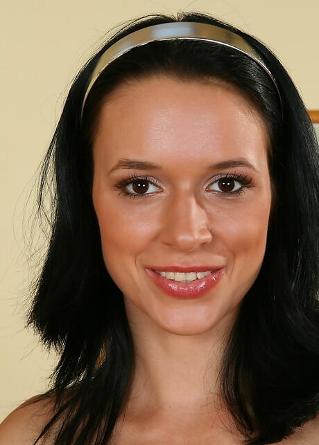 Stunning dark hair young Gwen shows big hooters and shaved pussy