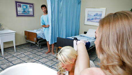 Stunning girls Katie Summers and Lily Lebeau in hot threesome sex in bathroom