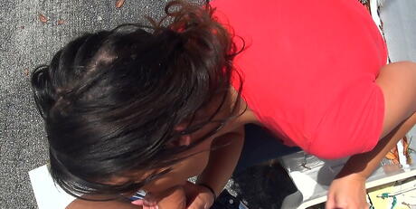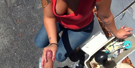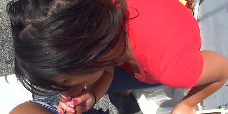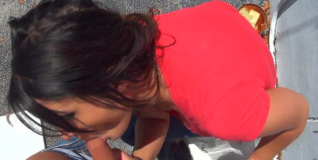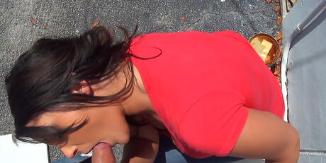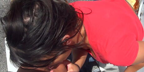 Stunning Jessica sucking hot big dick and takes a cum blast on her face outdoor