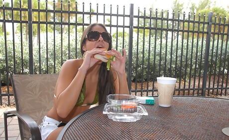 Stunning latin teen Moni in fancy shorts exhibiting her butt outside