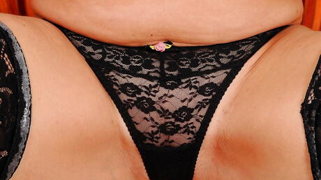 Stunning older Laura Long exposes her ass in fancy skirt and spreading her legs