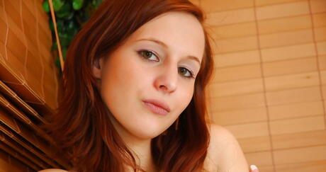 Stunning red-haired cutie Annie in sexy panties bares big knockers and toys her cunt