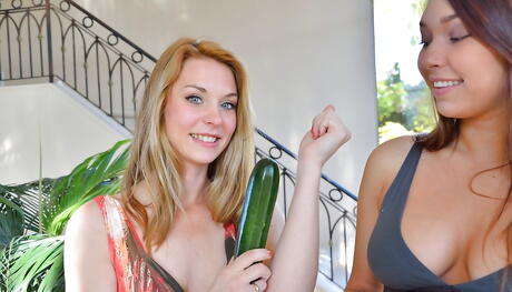 Stunning women Michele Monroe and Erin in sexy skirt having fun with dildo outdoor