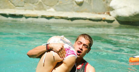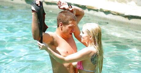 Sultry american blonde Christie Stevens exhibiting big tits and sexy ass at pool