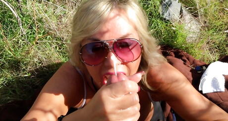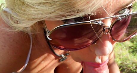 Sultry american blonde housewife Sandra Otterson sucking on huge cock and takes a hot cumshot outdoor