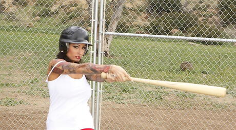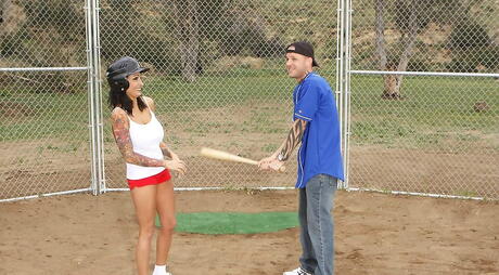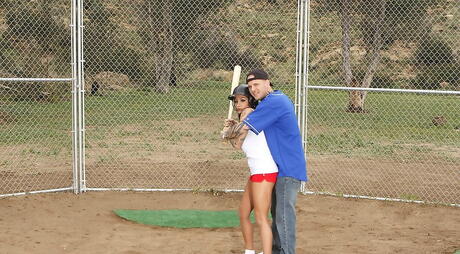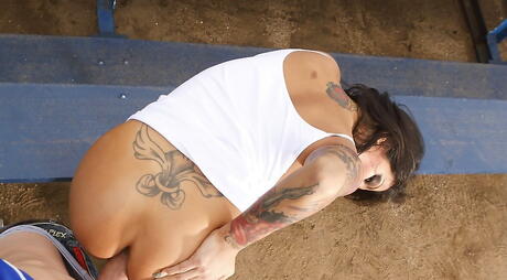Sultry american Ricki Raxxx in fancy shorts fucked in her nice pussy after wet blowjob outside