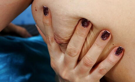 Sultry blonde aged Netty denudes big boobs and masturbates
