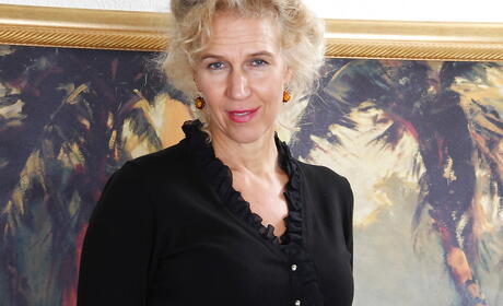 Sultry british blonde mature Cally Jo shows big titties and hairy pussy