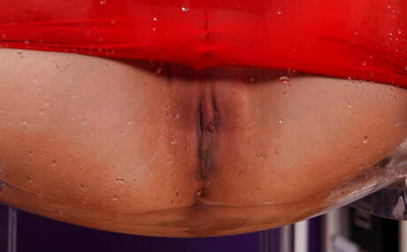Sultry dark-haired cutie Mia Michele in fancy pantyhose baring her butt and spreading her legs