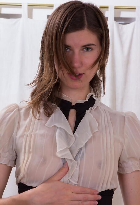 Sultry dark-haired Kiyoko revealing tiny tits and puting a toy in her pussy in office