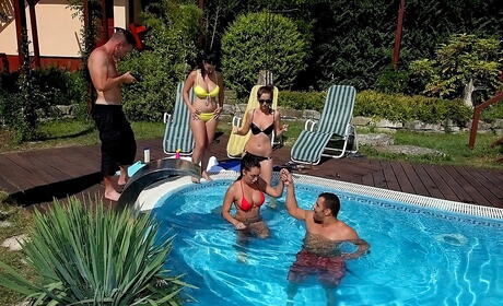 Sultry girls Chrissy, Roseline Love and Kendra Star in crazy orgy near the pool