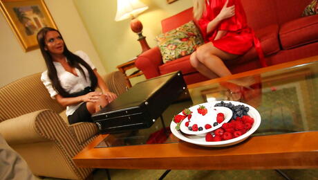 Sultry women Lux Kassidy and Rebecca Rayann in sexy skirt licking hot pussies and giving a pleasure with sex toy in the bathroom