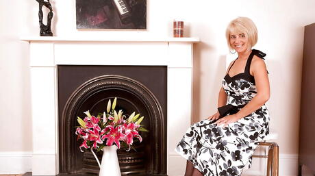 Superb aged Dana in fancy skirt exposing big boobies and playing with dildo