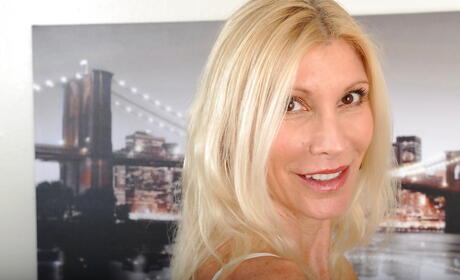 Superb american blond mature Cameo in undies bares big tits and spreads her legs
