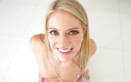 Superb american blonde Candice Dare sucks on big rod and enjoys a cumshot on face