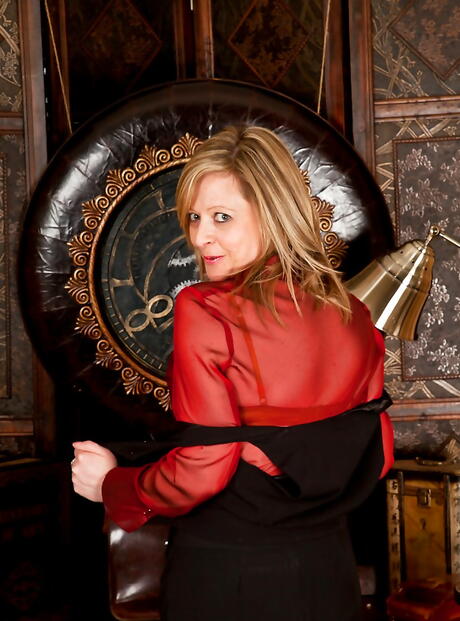 Superb british blonde mature Louise Pearce exposes her ass in fancy skirt and shaved pussy