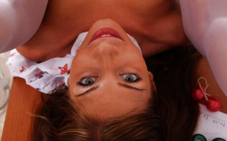 Superb czech babe Rachel Evans shows her ass in uniform outfit and playing with toy in office