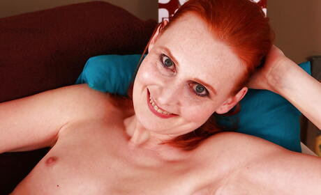Superb red-haired aged Bachova exposes small tits and masturbates