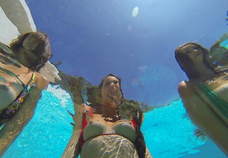 Superb women Teal Conrad, Celeste Star and Malena Morgan enjoy a lesbian foreplay near the pool