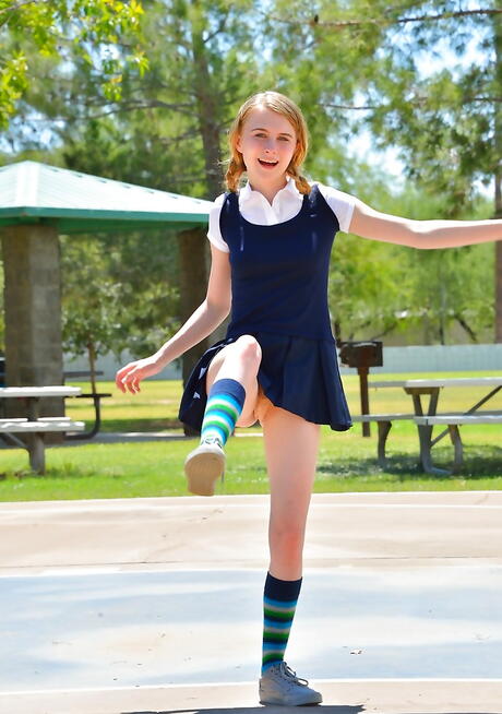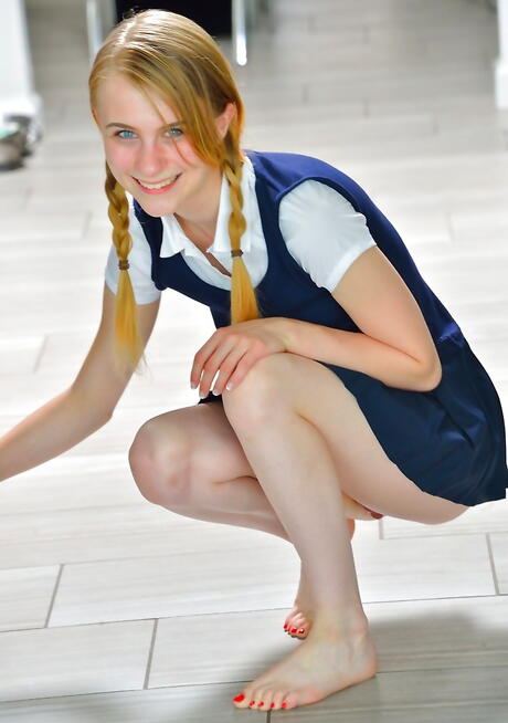 Svelte american blond young Charlotte Carmen bares tiny tits and spreads her legs