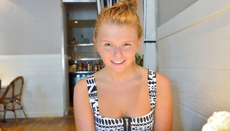 Svelte american blonde teen Melissa May in fancy shorts exposes tiny tits and plays with dildo outdoor