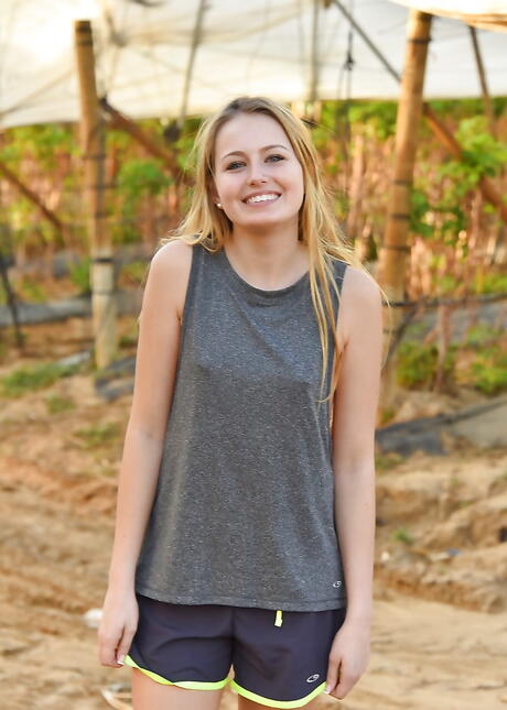 Svelte american blonde youthful Scarlett Sage exposing tiny tits and playing with toy on the beach