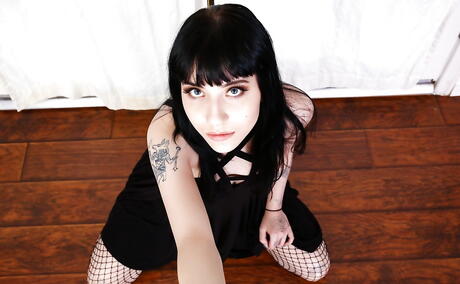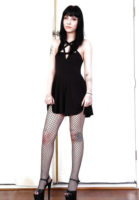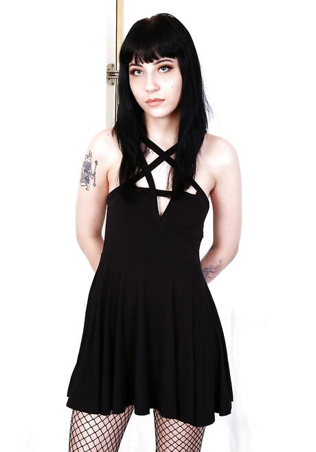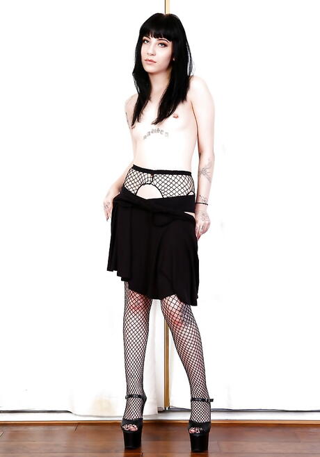 Svelte american brunette Charlotte Sartre uncovering small tits and bald pussy